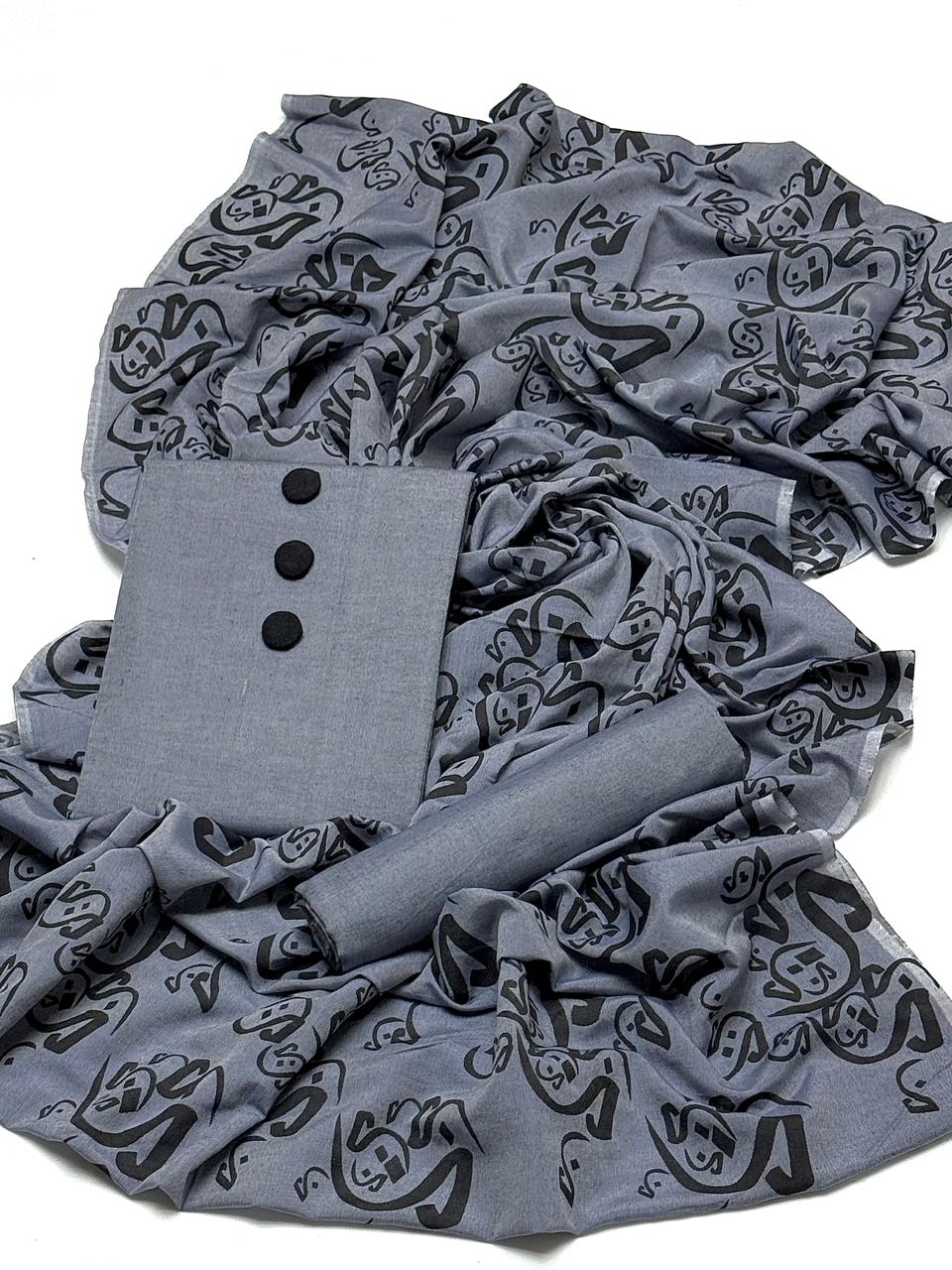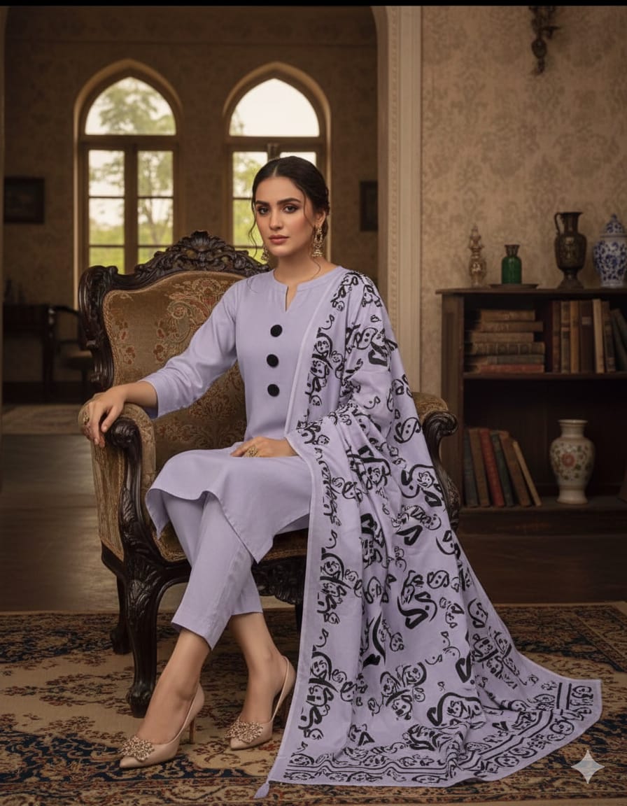 Dupatta: Khoobsurat Calligraphy print jo is suit ko aik artistic aur modern look deta hai.